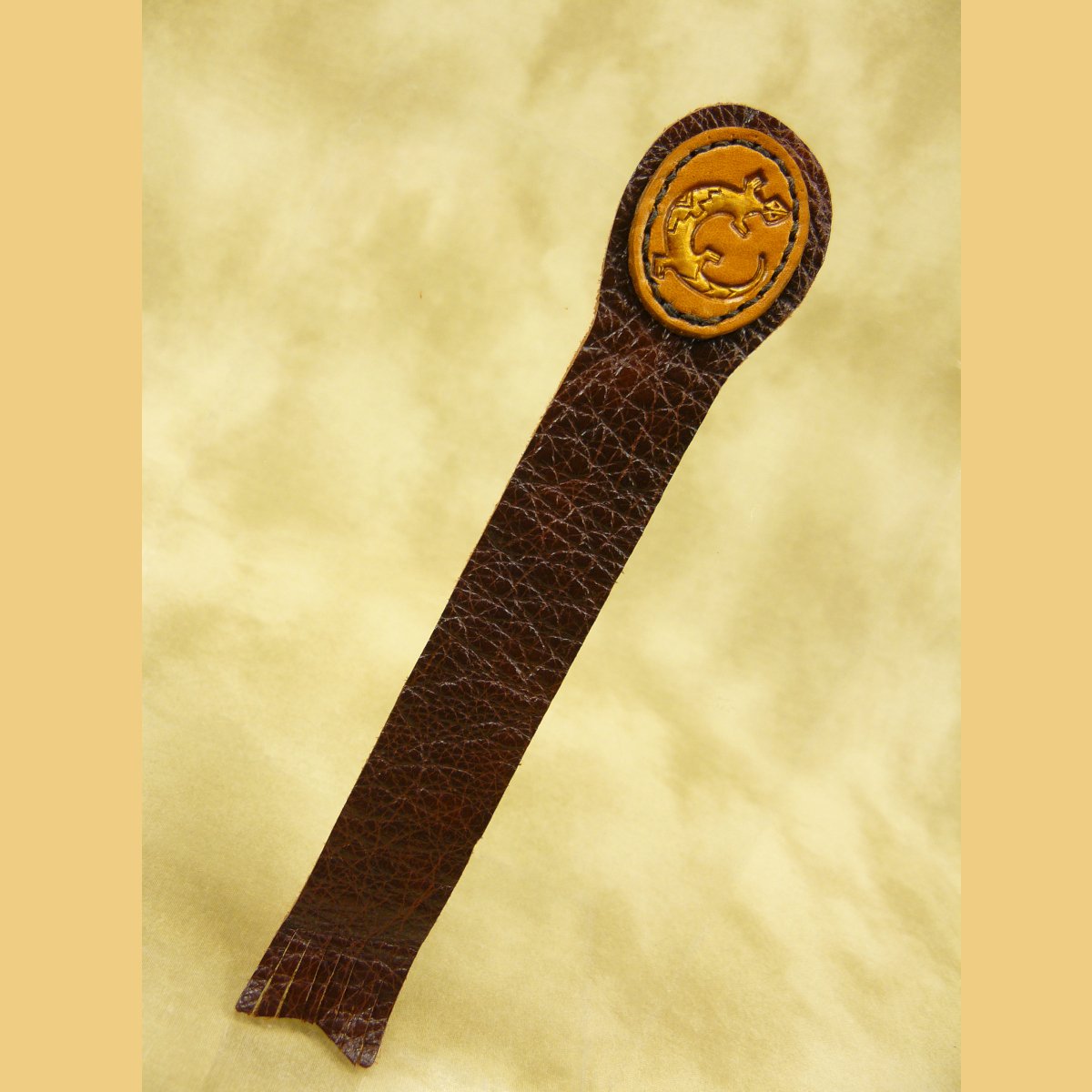 Made with soft upholstery weight chrome tanned leather with a stitched veg-tan overlay with a stamped and colored Native American lizard design. Thin leather fits unobtrusively between the pages of your favorite book, and the overlay helps to keep the bookmark in easy reach.