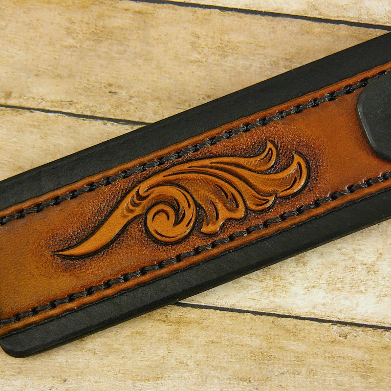 Made from top grade veg tanned tooling leather, the design goes beyond a mere stamped impression or two and a single color wash of dye, and the construction goes beyond a single piece of leather with a riveted key ring. The shape and size of this design offers more possibilities for more intricately carved/stamped/colored ornamentation. The overlay is saddle-stitched, and the edges are burnished and sealed.