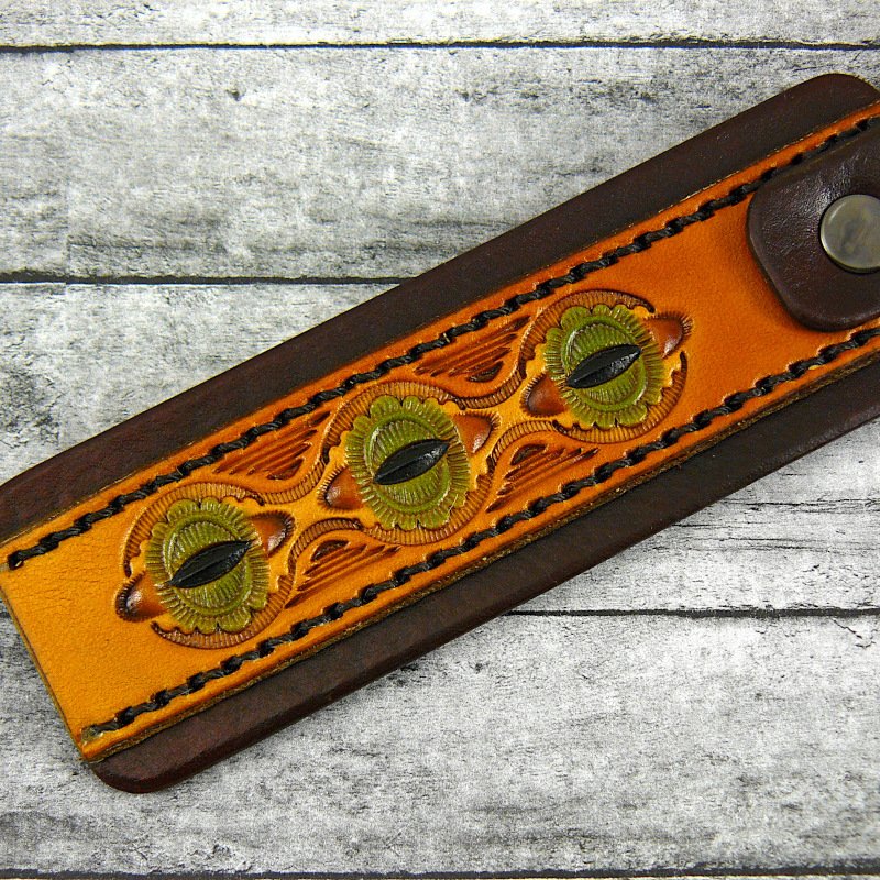 Made from top grade veg tanned tooling leather, the design goes beyond a mere stamped impression or two and a single color wash of dye, and the construction goes beyond a single piece of leather with a riveted key ring. The shape and size of this design offers more possibilities for more intricately carved/stamped/colored ornamentation. The overlay is saddle-stitched, and the edges are burnished and sealed.