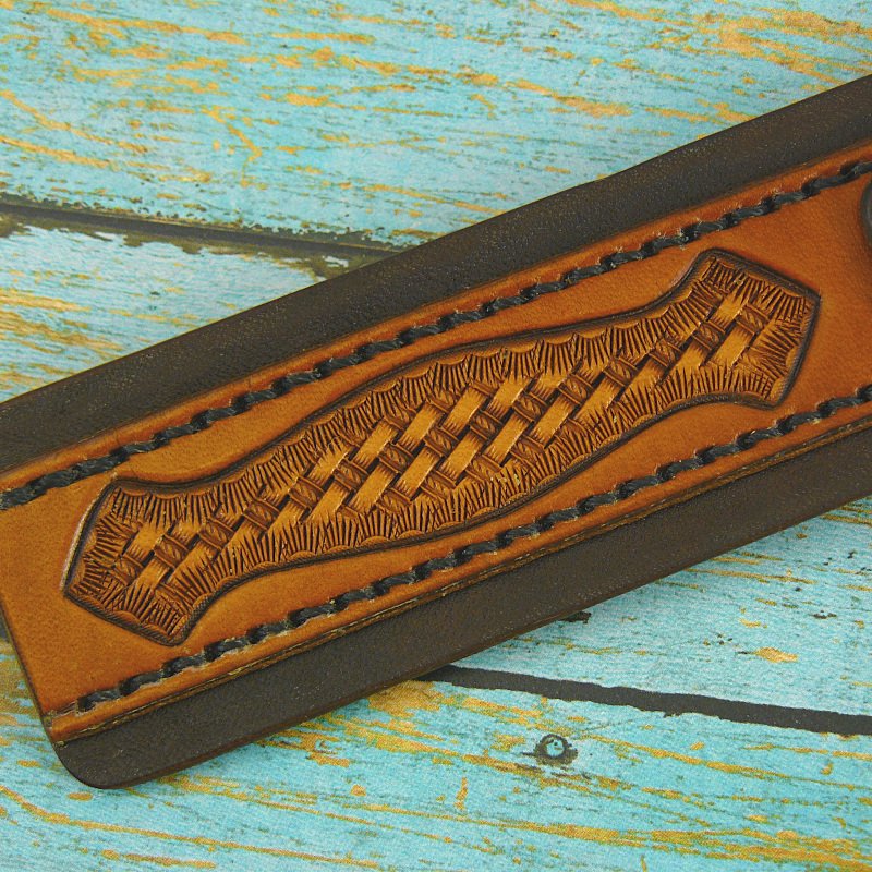 Made from top grade veg tanned tooling leather, the design goes beyond a mere stamped impression or two and a single color wash of dye, and the construction goes beyond a single piece of leather with a riveted key ring. The shape and size of this design offers more possibilities for more intricately carved/stamped/colored ornamentation. The overlay is saddle-stitched, and the edges are burnished and sealed.