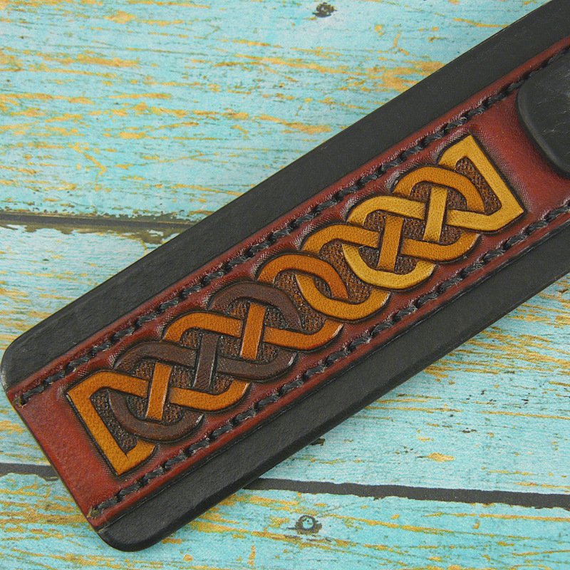 Made from top grade veg tanned tooling leather, the design goes beyond a mere stamped impression or two and a single color wash of dye, and the construction goes beyond a single piece of leather with a riveted key ring. The shape and size of this design offers more possibilities for more intricately carved/stamped/colored ornamentation. The overlay is saddle-stitched, and the edges are burnished and sealed.