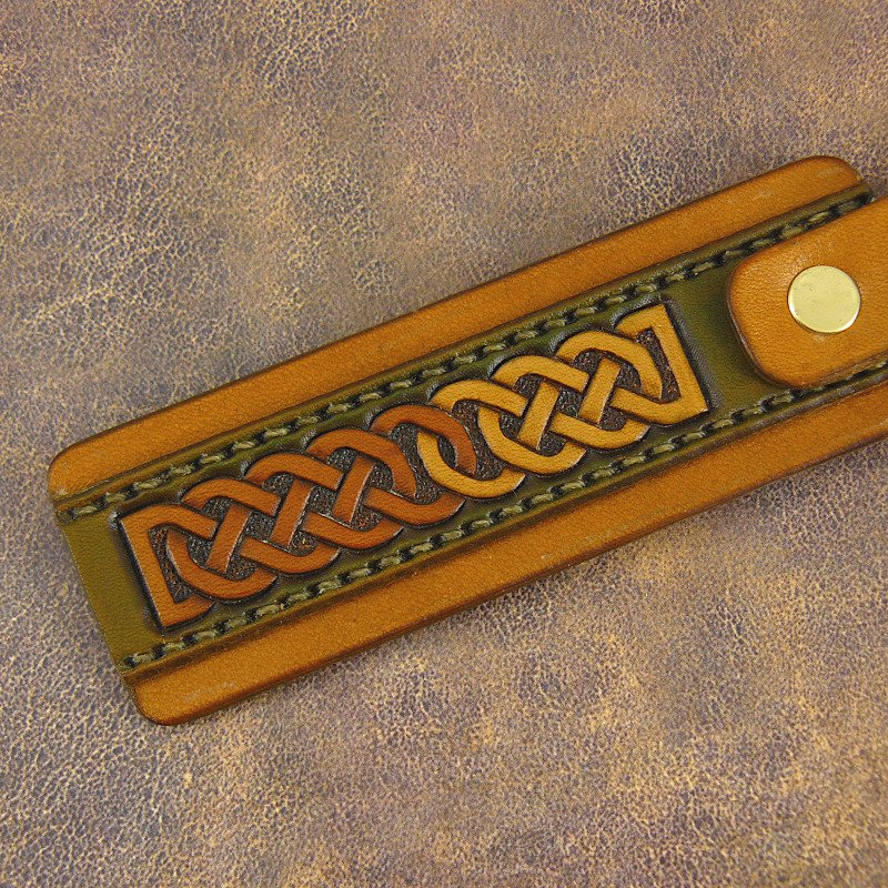 Made from top grade veg tanned tooling leather, the design goes beyond a mere stamped impression or two and a single color wash of dye, and the construction goes beyond a single piece of leather with a riveted key ring. The shape and size of this design offers more possibilities for more intricately carved/stamped/colored ornamentation. The overlay is saddle-stitched, and the edges are burnished and sealed.